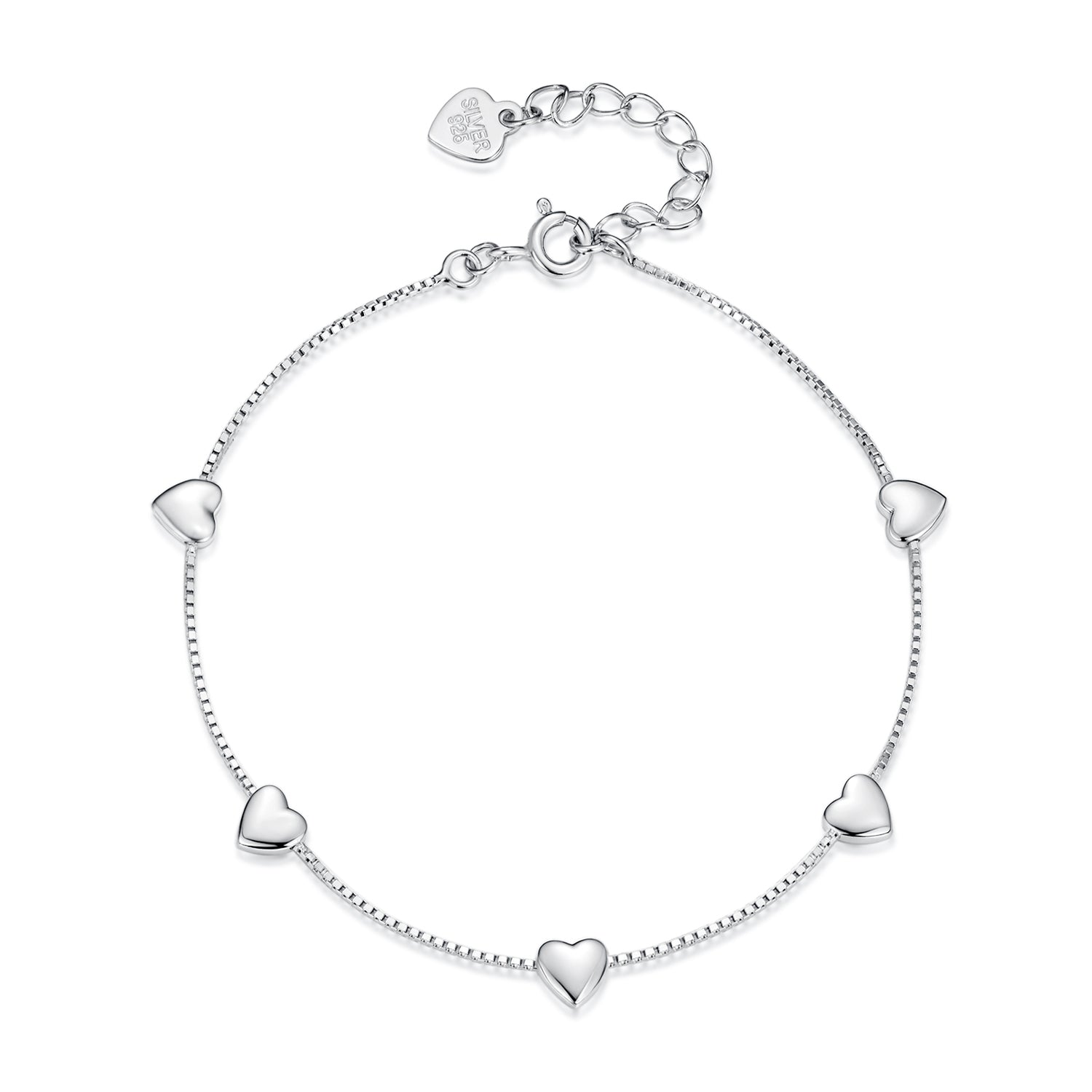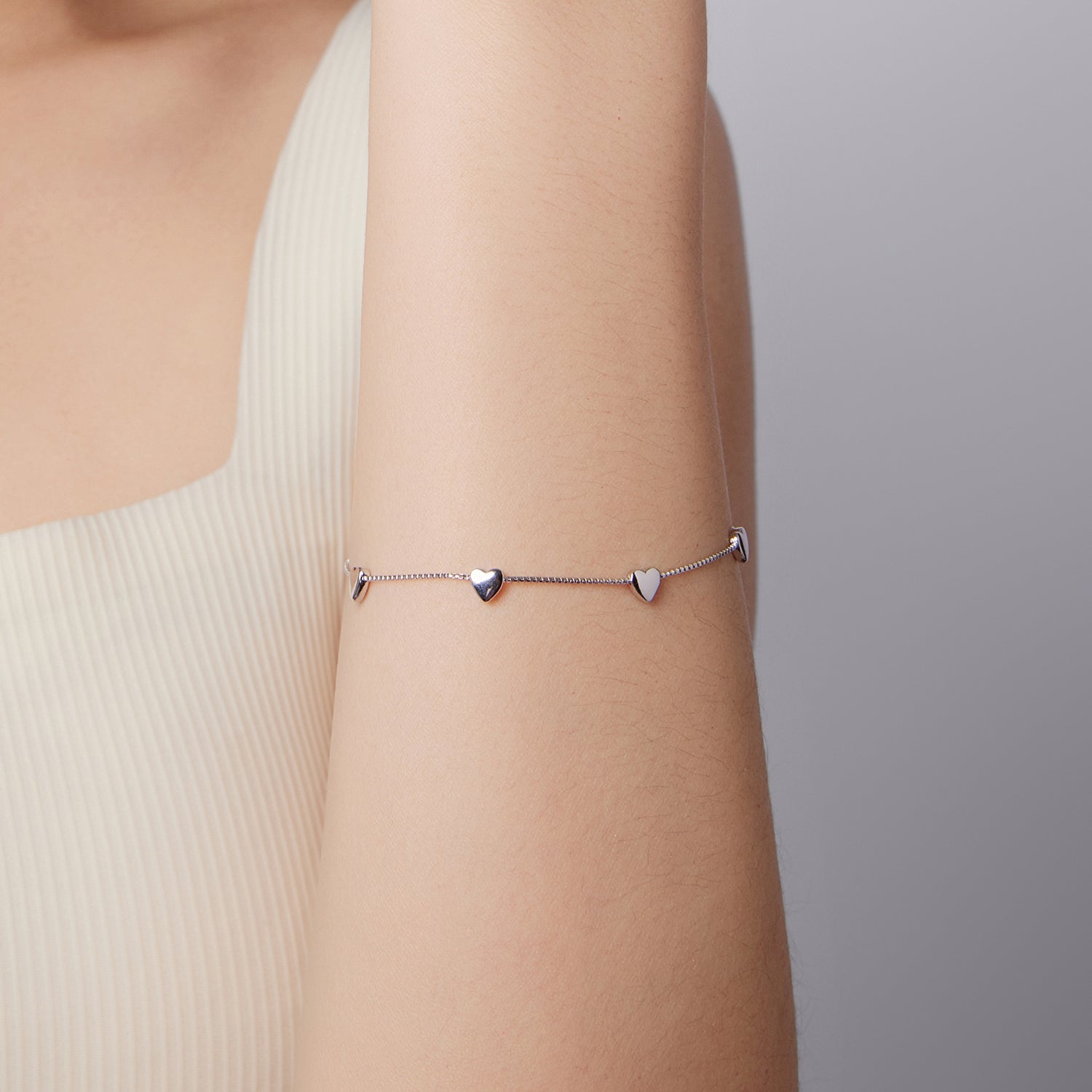 A dainty sterling silver bracelet with polished heart charms spaced along the chain. Feminine, elegant, and versatile for casual or dressy occasions.