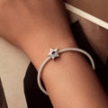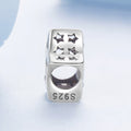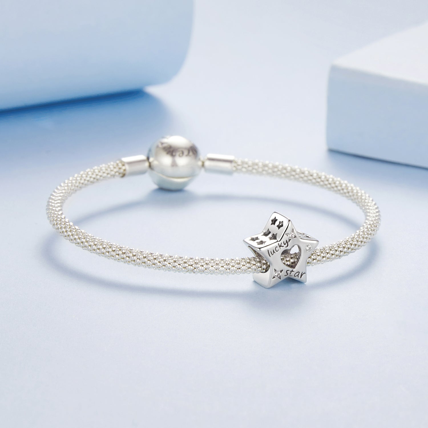 A sterling silver star-shaped charm with heart and star cut-outs, engraved with “lucky star” for good fortune.