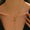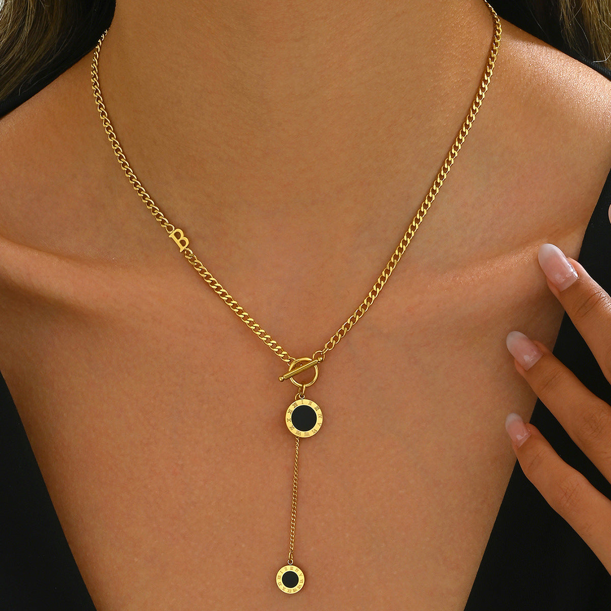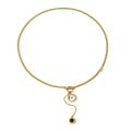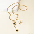 A chic toggle-style necklace with two black enamel circle drops. Modern, eye-catching and ideal for dressy or casual looks.