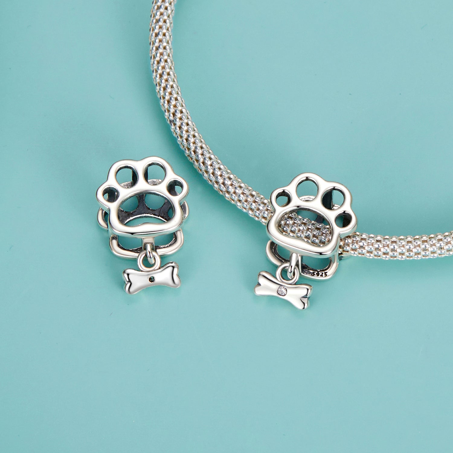 Celebrate your furry friends with this sterling silver paw print charm, complete with a dangling bone accented by a sparkling stone.